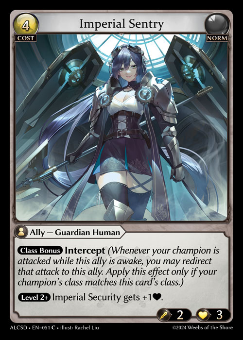 Class BonusIntercept (Whenever your champion is attacked while this ally is awake, you may redirect that attack to this ally. Apply this effect only if your champion’s class matches this card’s class.)